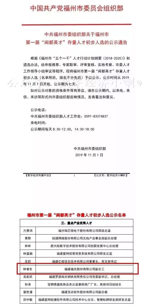 福州市委組織部根據《人才行動計劃綱要》和遴選辦法,對福州市各界優秀社會工作專業人才進行評選,福光股份林春生副總工程師獲評第一屆“閩都英才”重點產業優秀人才。