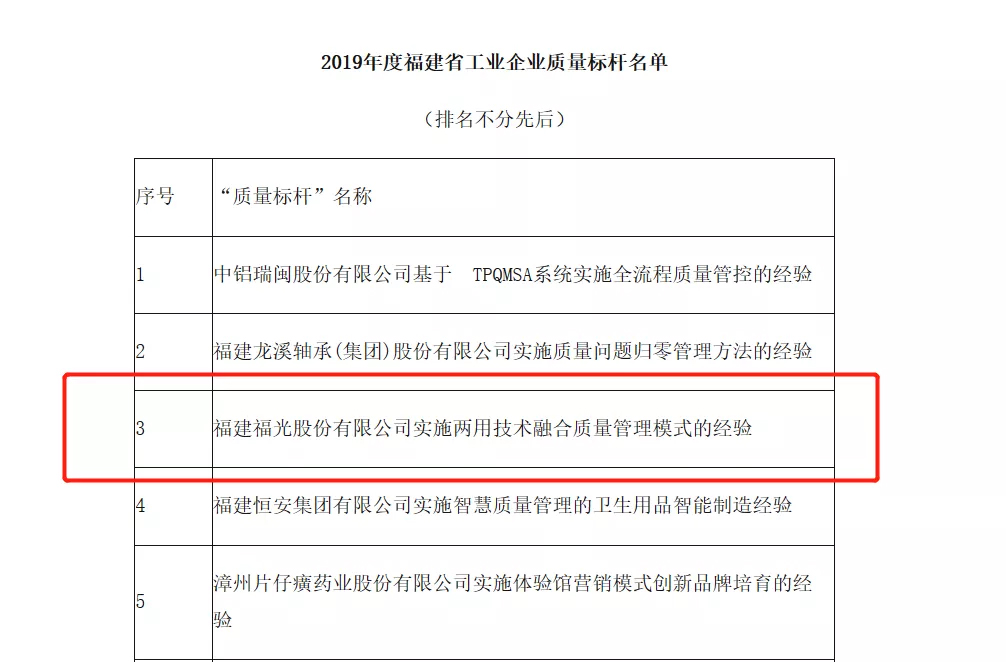 根據《福建省工業和信息化廳關于開展2019年質量標桿活動的通知》(閩工信科技〔2019〕122號)要求,經企業自愿申請、有關單位推薦和專家評審,并經省工信廳廳長辦公會研究,全省共有15家企業通過評審。其中,福建福光股份有限公司(以下簡稱“福光股份”)實施兩用技術融合質量管理模式的質量品牌管理典型經驗獲評2019年度省級質量標桿。